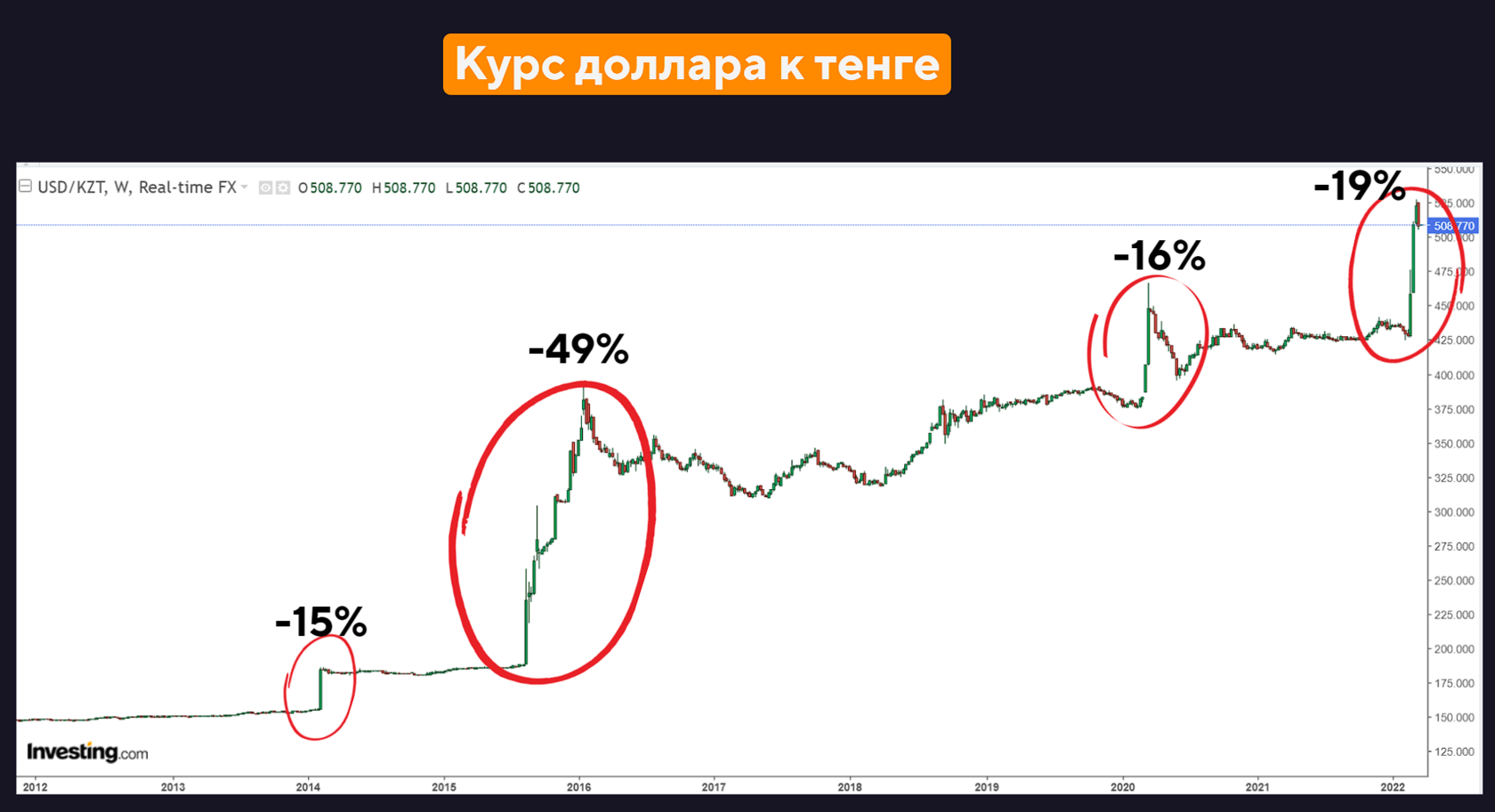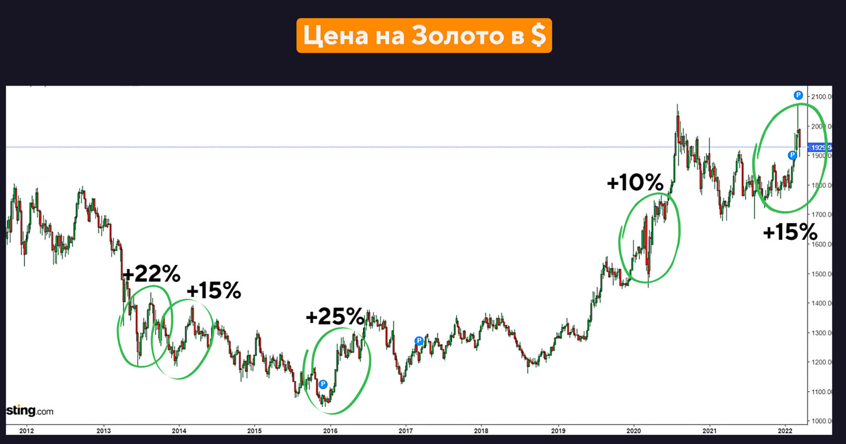 Если посмотреть на график цены золота (ниже), можем заметить, что в моменты неопределённостей (когда наступал кризис или конфликт), цена на золото подскакивала. Это объясняется тем, что в момент кризисов люди продают волатильные активы (криптовалюта, акции технологических и молодых компаний, тенге) и перекладывают свои накопления в более стабильные активы (в данном случае золото), тем самым повышая ее цену. Ведь как известно, если возникает высокий спрос, то цены на этот товар растут. Цену любого товара диктуют спрос и предложение.